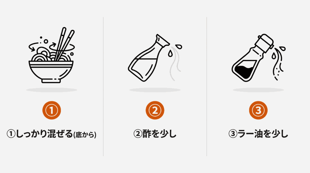 2.濃いと感じたら、酢→ラー油の順で少しずつ