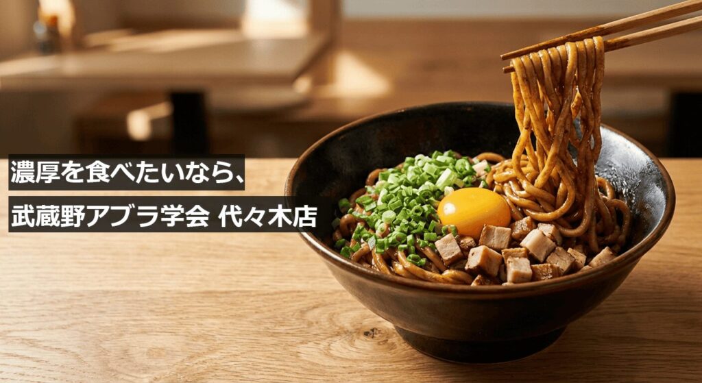 このページは「新宿の油そば◯選」みたいなまとめではなく、濃厚の気分の日に外しにくい1店舗として、武蔵野アブラ学会 代々木店を深掘りするガイドです。食べ方、味変、デリバリー、混雑回避まで、ここだけ読めばOKにしてあります。